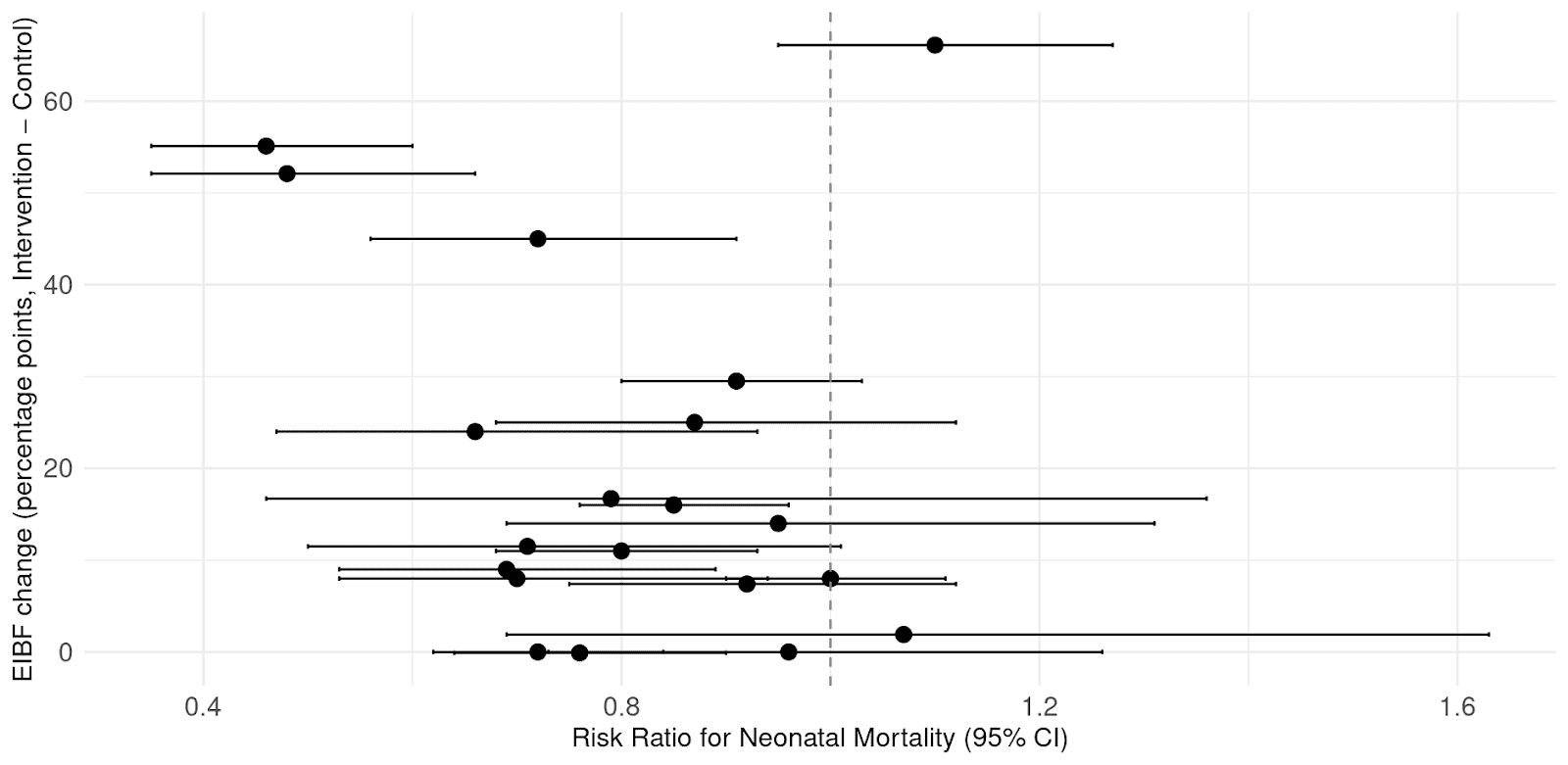 Across this set of trials, we found that interventions producing larger increases in EIBF rates generally also showed greater reductions in neonatal mortality. While correlation cannot establish causation, the pattern is consistent with the other evidence that we summarized in our previous report: EIBF involves biological mechanisms likely to reduce mortality, and there is strong observational evidence linking EIBF to lower mortality.